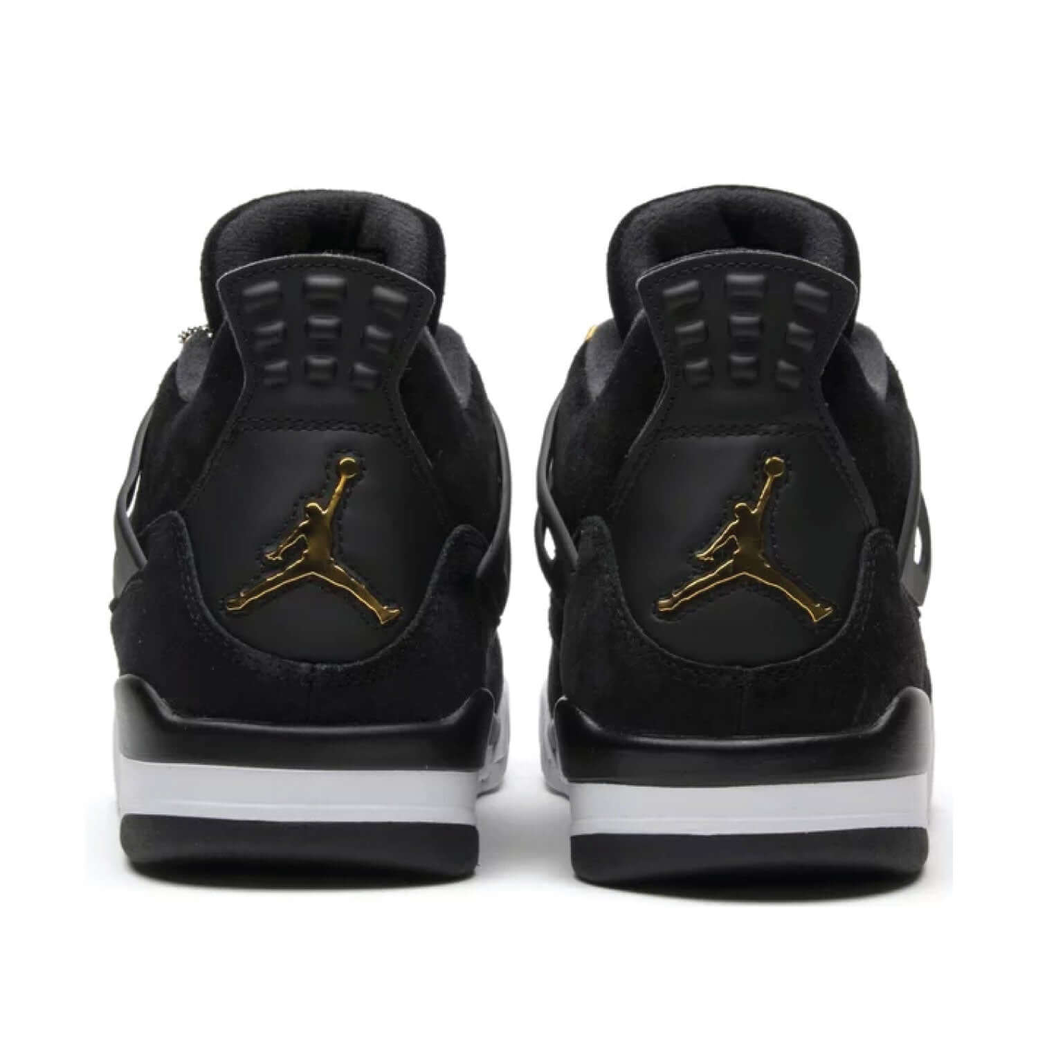 The Air Jordan 4 Retro ‘Royalty’ pairs a monochromatic black suede upper with contrasting metallic gold accents. They shine on the signature molded eyelets and a Jumpman icon on the synthetic leather heel panel. Additional Jumpman branding lands on the woven tongue tag and rubber outsole, featuring a traditional herringbone traction pattern for optimal grip.